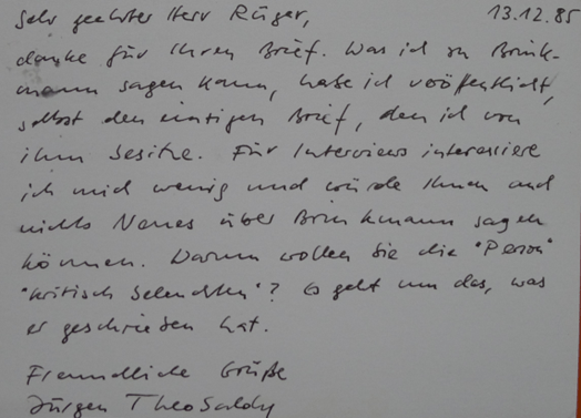 Sehr geehrter Herr Rüger, vielen Dank für Ihr Schreiben vom 30. November – ich glaube aber, daß ich kein ergiebiger Interviewpartner für Sie wäre. Ich habe seinerzeit (Ende der 60er/Anfang der 70er?) einen Gedichtband von Brinkmann & eine von ihm herausgegebene Anthologie verrissen, & das war alles, was ich zu dem Thema beizusteuern hatte, für seine späteren Arbeiten habe ich kein Interesse mehr aufbringen können, ihn persönlich habe ich nicht gekannt. Da ich auch einen Materialband über Brinkmann nicht vermisse, sehe ich keinen Anlaß, mich an ihrem Vorhaben zu beteiligen & bin mit freundlichen Grüßen Ihr Yaak Karsunke