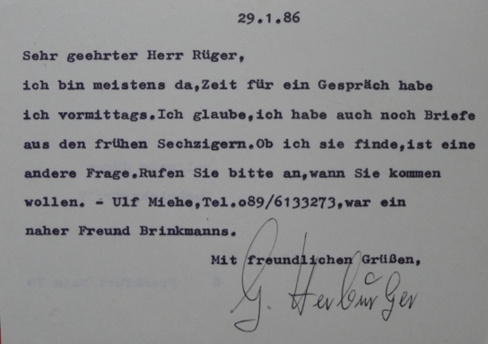 Im Zuge meiner Brinkmann-Arbeit habe ich Maleen Brinkmann dreimal angeschrieben (21.11.1985/ 29.4.1986/ 21.5.1987). Auf alle drei Briefe hat sie nicht geantwortet.